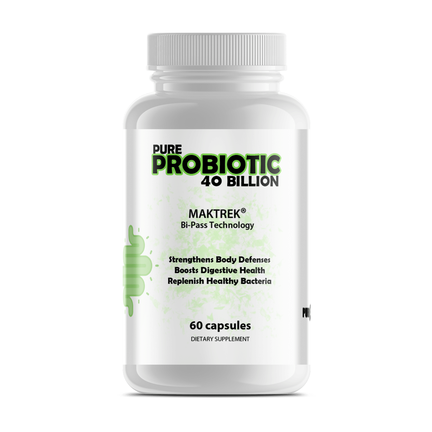 Pure Probiotics contain 40 billion units of colony forming units(CFU) to help improve or balance your microbiota. With MAKTrek® Bi-Pass Technology Pure Probiotics is formulated for a higher level of absorption. MAKTrek® Bi-Pass Technology is a patented formula that helps to improve the absorption of probiotics specifically within the body. MAKTrek® works by protecting the capsule with a protective layer keeping it safe in the stomach. This is so that it isnt broken down early by digestive enzymes in the stomach or intestines.